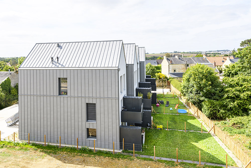 Les bâtiments proposent des toitures à double pente pour l’ensemble des bâtiments. Les faîtages sont implantés parallèlement à la rue, reprenant les codes architecturaux des maisons de ville de l’avenue du Général Leclerc et plus généralement du centre de Verson. Ceci étant valable à la fois pour le bâtiment A sur rue, que pour le B en cœur d’îlot. Les descentes EP sont intégrées (à l’ouest côté jardin) le plus judicieusement possible afin de respecter les exigences techniques en matière de gestion des eaux pluviales, mais également de ne pas perturber le dessin général des façades.